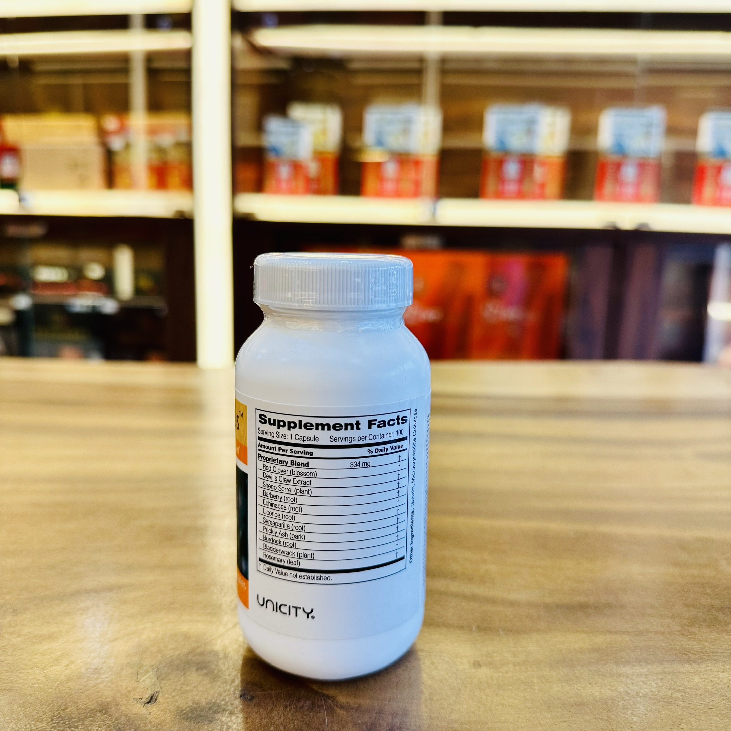 Hoa Red Clover (hoa cỏ ba lá đỏ), Devil’s Claw Extract, sheep sorrel (cây me đất chua), barberry root, Echinacea root (rễ cây cúc dại), licorice root (rễ cây cam thảo), sarsaparill root (rễ cây thổ phục linh), prickly ash (bark), burdock root (rễ cây ngưu bàng), bladderwack (tảo bẹ), rosemary leaf (lá cây hương thảo)